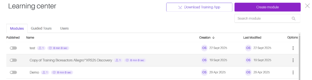 On HakoBio, in the Learning Center section, you can find all your training content as well as your Guided Tour. You can either stay on the web version by clicking on a module to access it directly, or switch to the desktop version for a better experience.