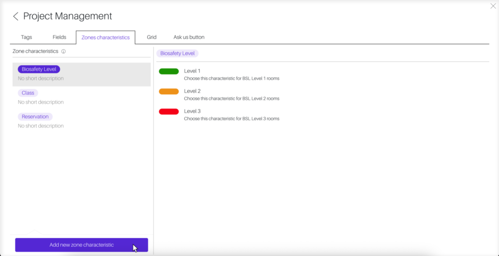 With the Zone Characteristics, you can assign key attributes to each room, helping you organize and classify your spaces. These attributes can be visualized directly in your digital twin and are also included in the Project Report.